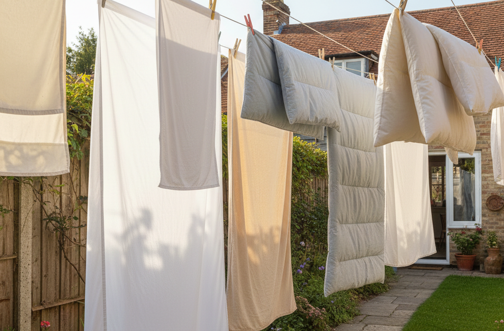 Las sábanas se secan mejor al aire libre, extendidas horizontalmente o en una soga con espacio suficiente para que el aire circule. El sol natural es un aliado antibacteriano natural, pero evitá la exposición directa prolongada en sábanas de colores intensos para prevenir la decoloración.